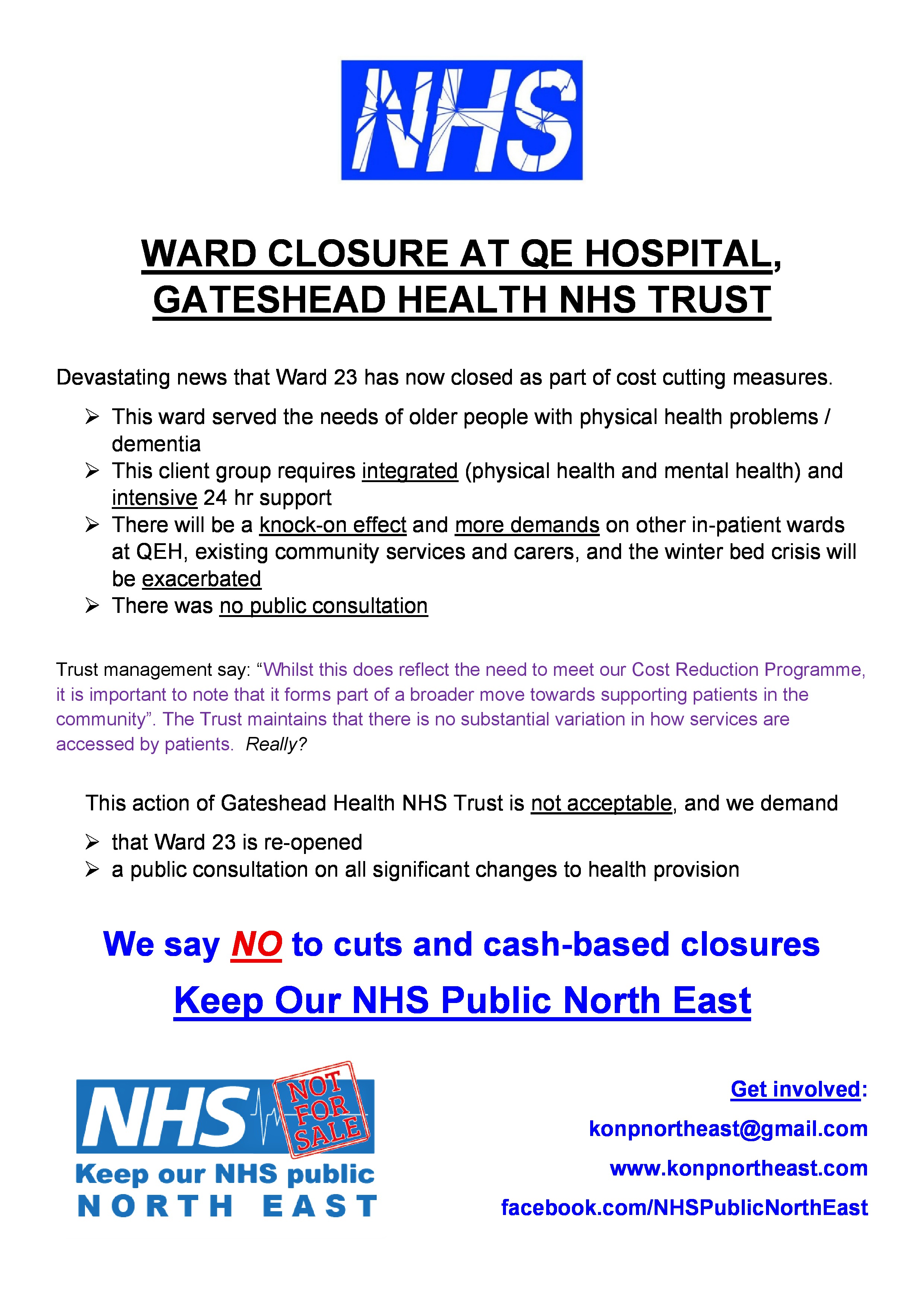 Gateshead Health NHS Trust recently made the decision to close Ward 23 at Queen Elizabeth Hospital without public consultation and without discussion with Gateshead Care, Health and Wellbeing Overview and Scrutiny Committee.