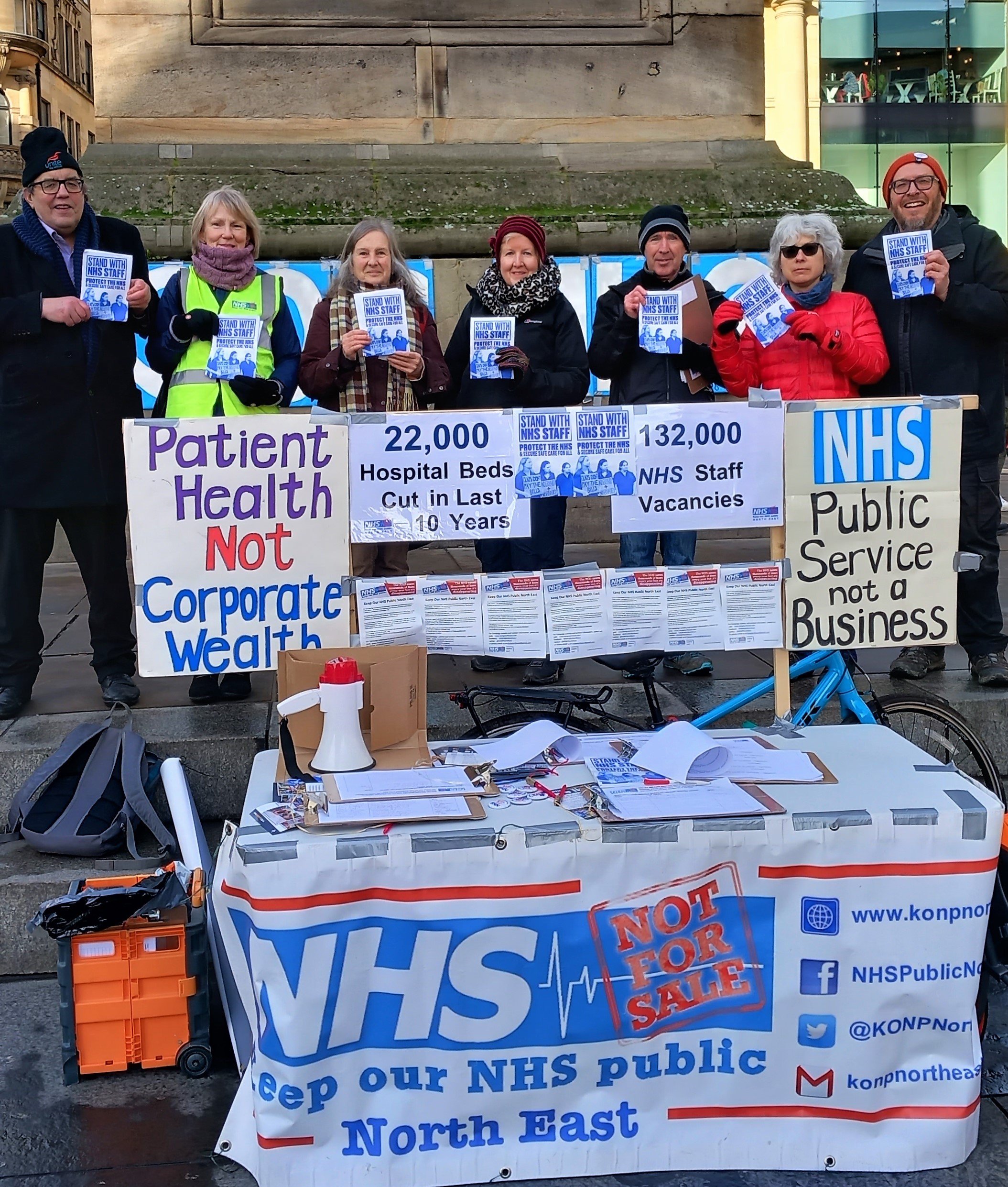 Today we joined up with North East Peoples Assembly. Similar events occurred throughout England, including events organised by our colleagues in South Tyneside and Sunderland, and with the many health campaign groups throughout England. The NHS Winter Day of Action was a national event, and KONPNE were proud to play our part in Newcastle. It is crucial to remain aware – Trump and Johnson are keen to work out a trade deal, and our NHS is “on the table”, no matter what they say. As long as NHS services are provided by private companies, our NHS is at risk.
